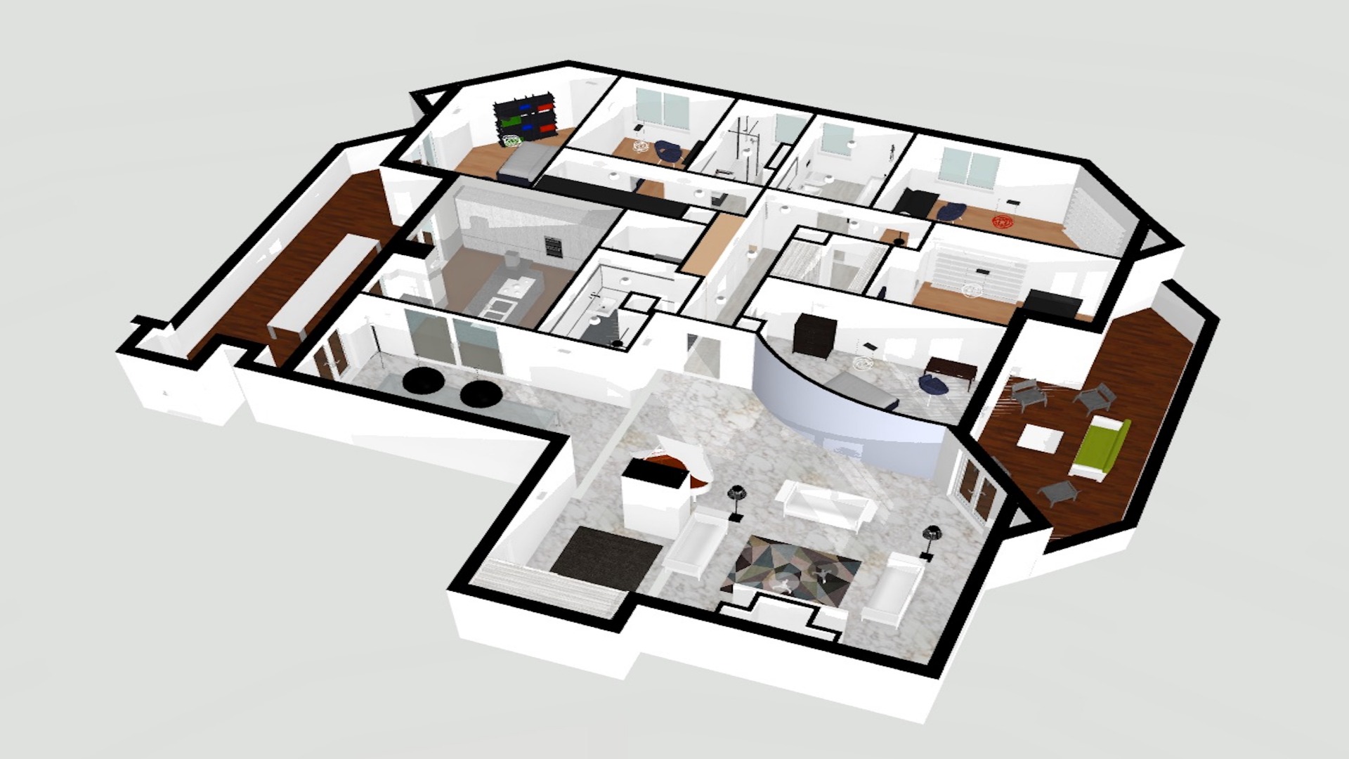 L'appartamento è caratterizzato da un'opera d'arte/parete realizzata site specific da Maria Cristina Finucci, oggi tra i più quotati artisti italiani; questo elemento distintivo al cuore del soggiorno crea un ambiente di spiccata personalità.